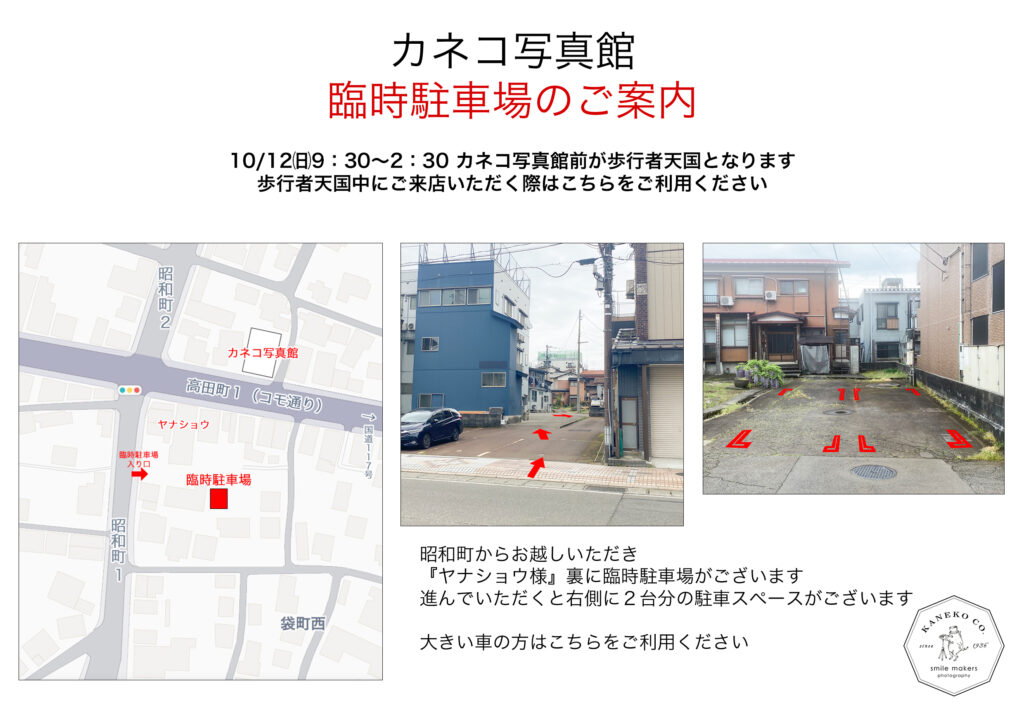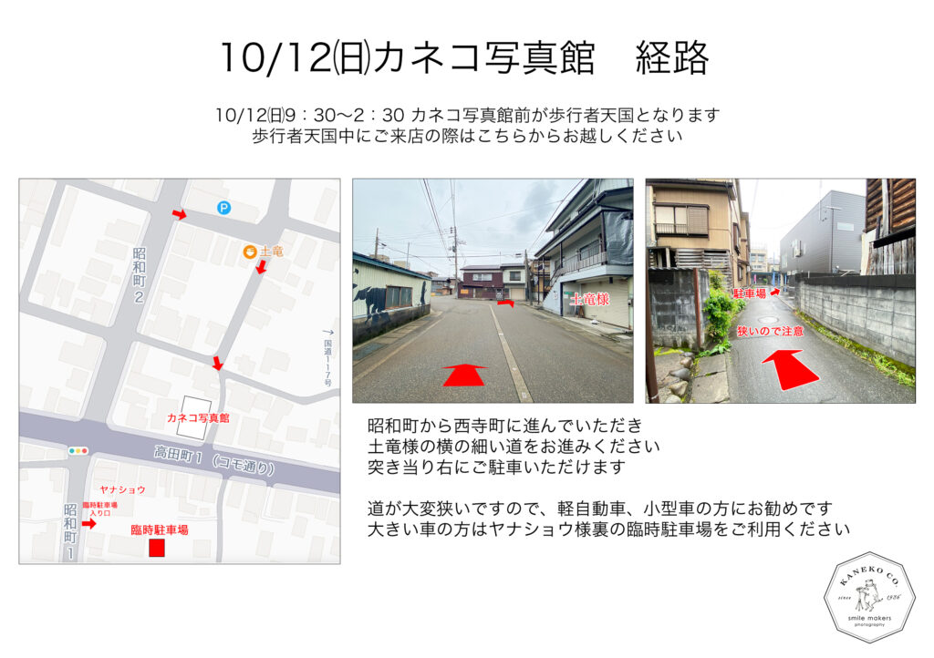 ☆☆☆10月12日 歩行者天国中の駐車場のご案内☆☆☆ いつもカネコ写真館をご利用いただきありがとうございます。 明日10月12日は生誕地祭り☆ カネコ写真館の前もおかめ市のため歩行者天国となります。 歩行者天国の時間は9:30~2:30 その間にご来店いただくお客様におかれましては、昭和町から西寺町に入っていただき、土竜様脇の道をまっすぐお進みください。 突き当り右側がカネコ写真館となります。 道幅が大変狭いですのでお気をつけてお越しください。(小型車の方向けです) もしくは臨時駐車場をご用意いたしましたのでそちらをご利用ください。 臨時駐車場はヤナショウ様の裏になります。 昭和町からお越しいただき、ヤナショウ様駐車場の右側のスペースとなります。 大きい車の方はこちらをご利用ください。 ご不便をおかけしますがどうぞよろしくお願いいたします。 明日はおかめ市にてリアラの出店もしております♬ お近くに来た際には是非お立ち寄りください♪